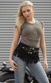 Ceinture en suède de vachette,avec deux boucles décoratives réglables. Avec bandelettes tressées, franges, clous et perles tout autour et doublée.
