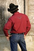 Chemisier à rayures avec une broderie élégante sur le devant et au dos, avec poches à rabat et boutons pression.