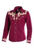 Chemise pour femme style western avec broderies au niveau de la poitrine, du dos et des poignets. Avec boutons pression et deux fausses poches sur le devant.